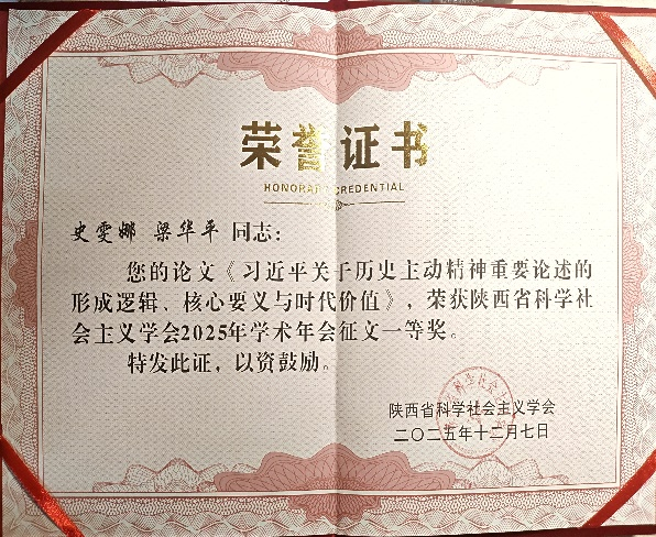 本次会议组织开展的学习贯彻党的二十届四中全会精神主题征文活动共收到论文60余篇,经专家评审,我院梁华平教授指导的硕士研究生史雯娜所撰论文《习近平关于历史主动精神重要论述的形成逻辑、核心要义与时代价值》荣获陕西省科学社会主义学会2025年学术年会征文一等奖。